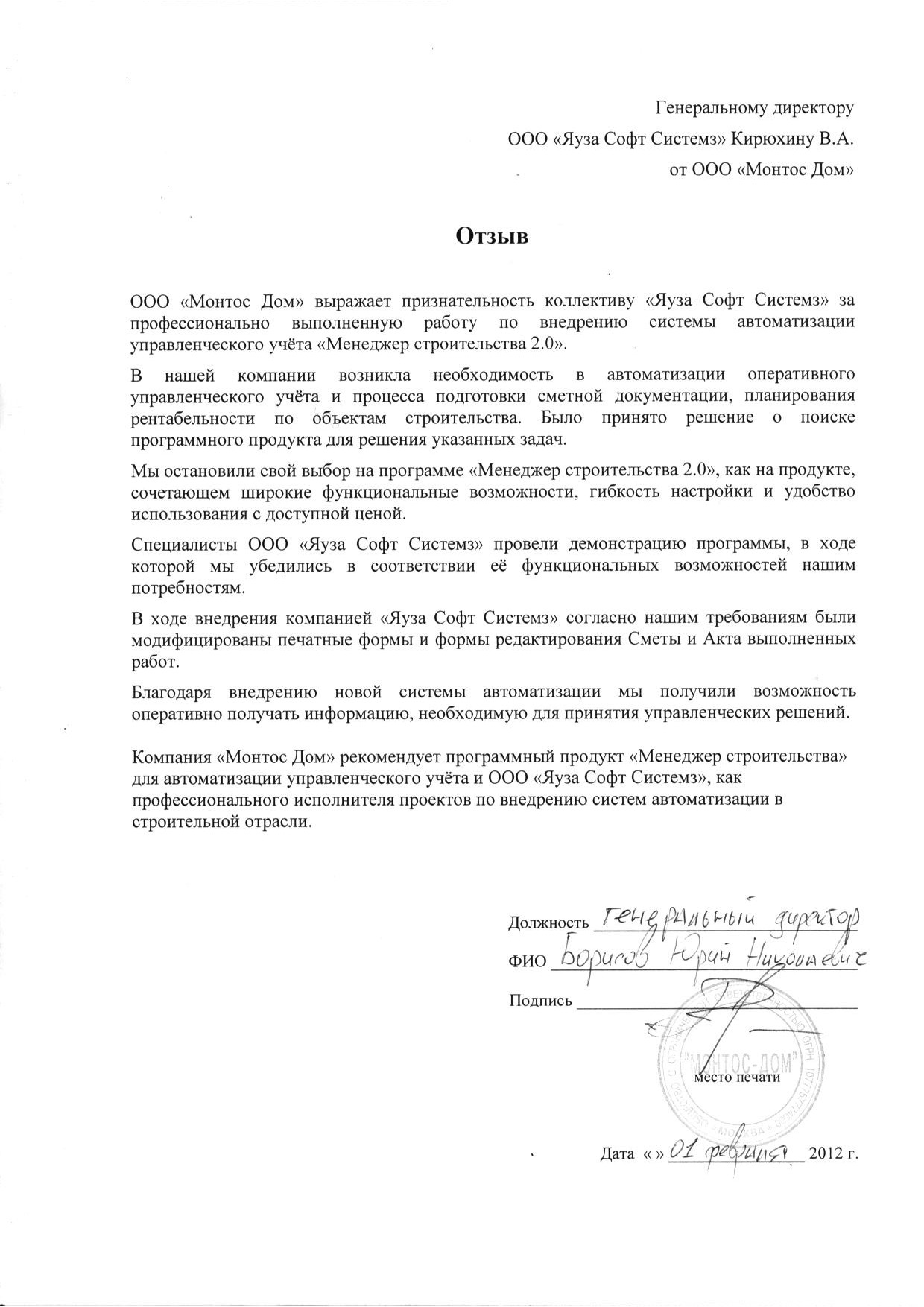 В результате изучения рыночного предложения руководством "Монтос Дом" было принято решение о приобретении программы Менеджер строительства. Этот выбор был продиктован тем, что компании нужно было готовое решение для комплексного управления строительством, которое с минимальными изменениями, и соответственно, с минимальными затратами на внедрение, могло бы решить задачу автоматизации учёта в компании.