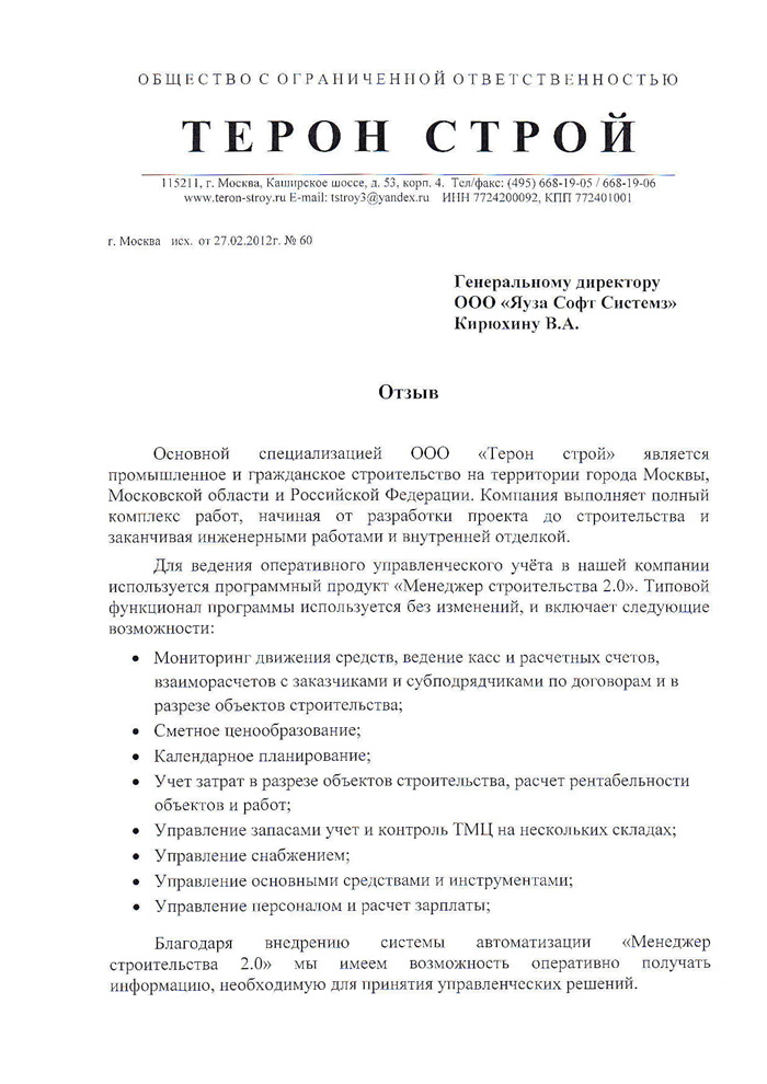 Внедрение конфигурации "Менеджер строительства" в компании Терон Строй
